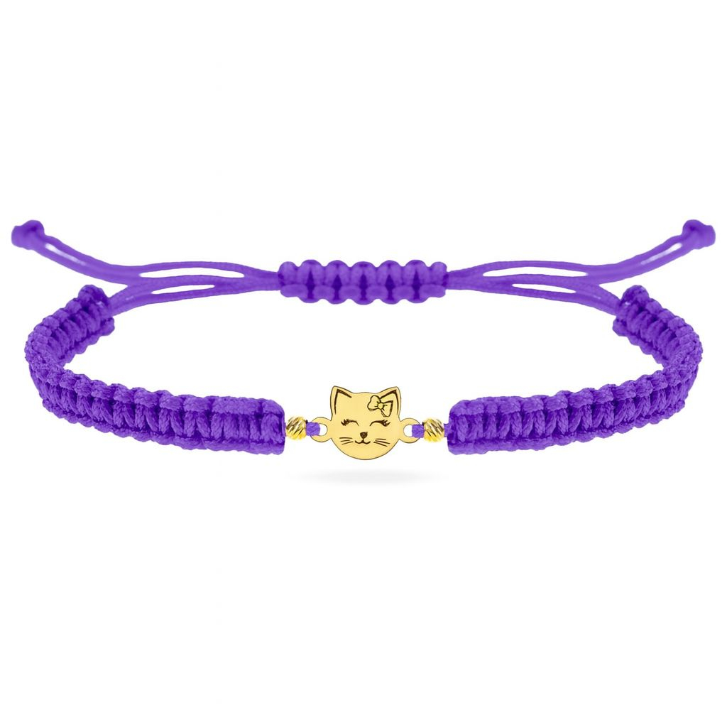 Bratara delicata si vesela, realizata din argint 925 placat cu aur de 24K, decorata cu un pandantiv in forma de pisicuta si bilute fatetate care adauga un plus de stralucire. Snurul mov impletit completeaza perfect designul feminin si jucaus, fiind un simbol al gingasiei si al elegantei.