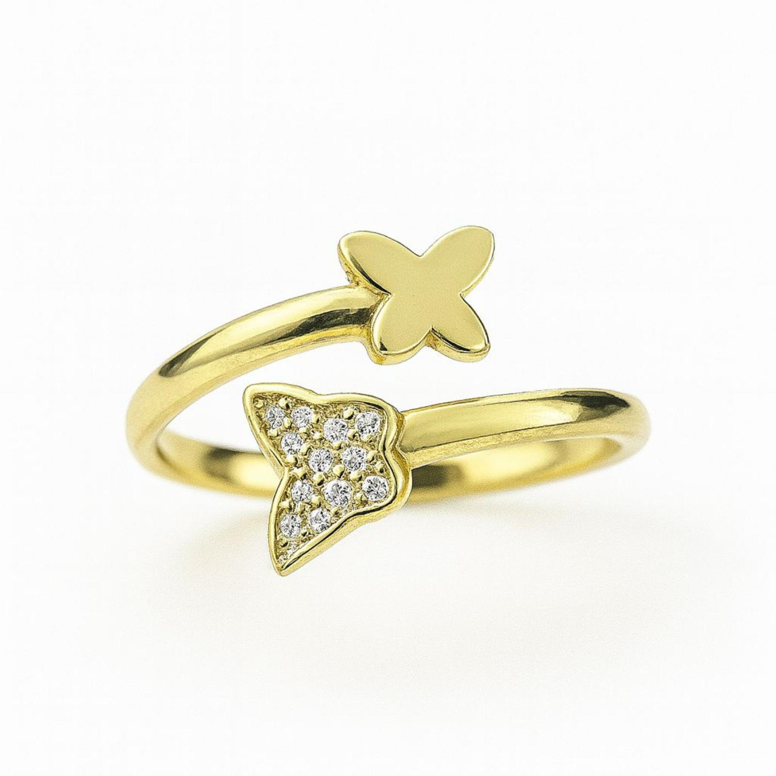 Un simbol delicat al feminității și libertății, inelul ''GOLDEN BUTTERFLY'' este realizat din aur galben și decorat cu doi fluturași – unul lucios și unul încrustat cu zirconii sclipitoare. Designul reglabil și asimetric adaugă un aer modern și jucăuș. Ideal pentru femei visătoare și rafinate.