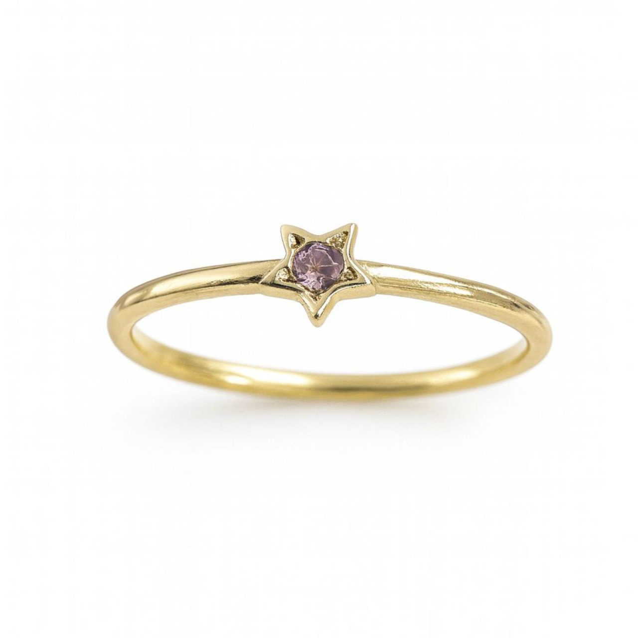 Un inel fin si delicat, realizat din aur galben, ce are in centrul atentiei o stea stilizata cu o piatra mov discreta. Este alegerea perfecta pentru iubitoarele de bijuterii minimaliste cu o nota jucausa si feminina. Usor de purtat singur sau alaturi de alte inele pentru un efect “stacking” modern.