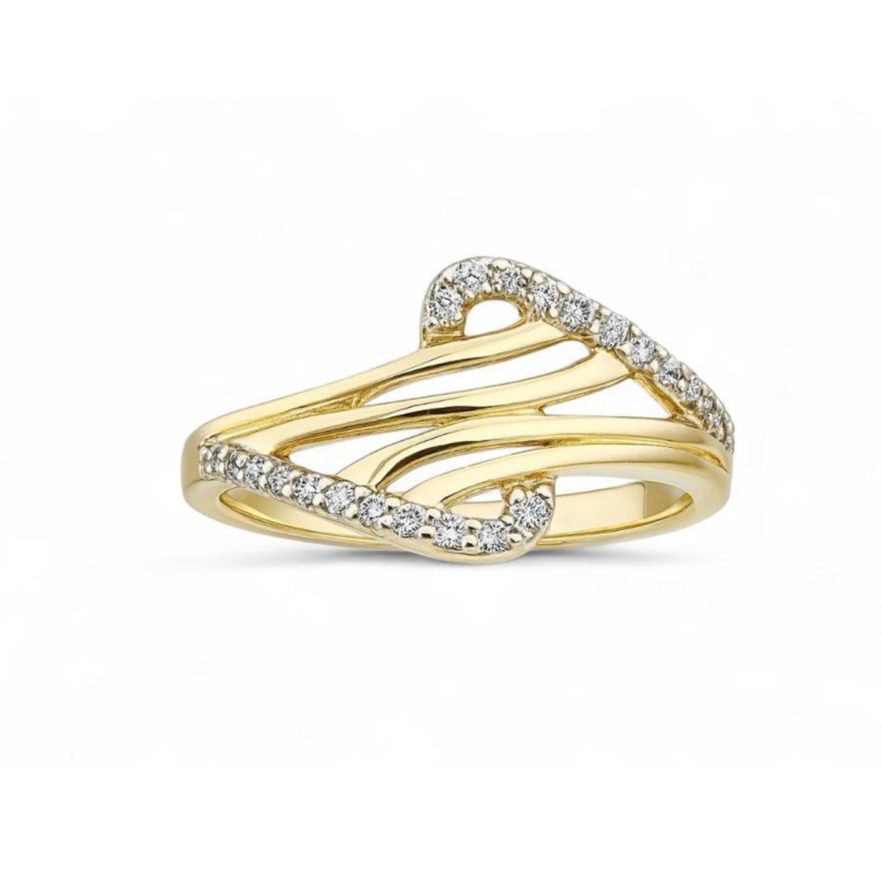 Inspirat de curgerea naturala a formelor, acest inel din aur galben atrage privirea prin liniile sale fluide si detaliile pavate cu pietre stralucitoare. Un design elegant si modern care adauga rafinament oricarei tinute. Ideal pentru femeile care iubesc bijuteriile cu personalitate si stil unic.