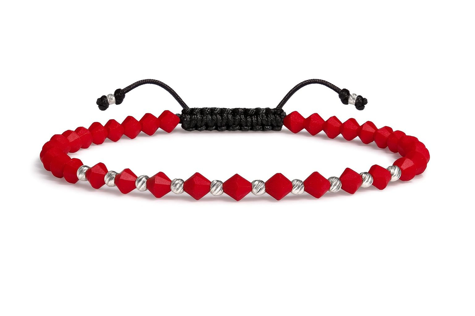 Bratara realizata manual, cu cristale de sticla rosii fatetate si bilute din Argint 925, pe snur negru impletit, reglabil. Design vibrant si elegant, perfect pentru a adauga o nota de culoare si personalitate oricarei tinute.