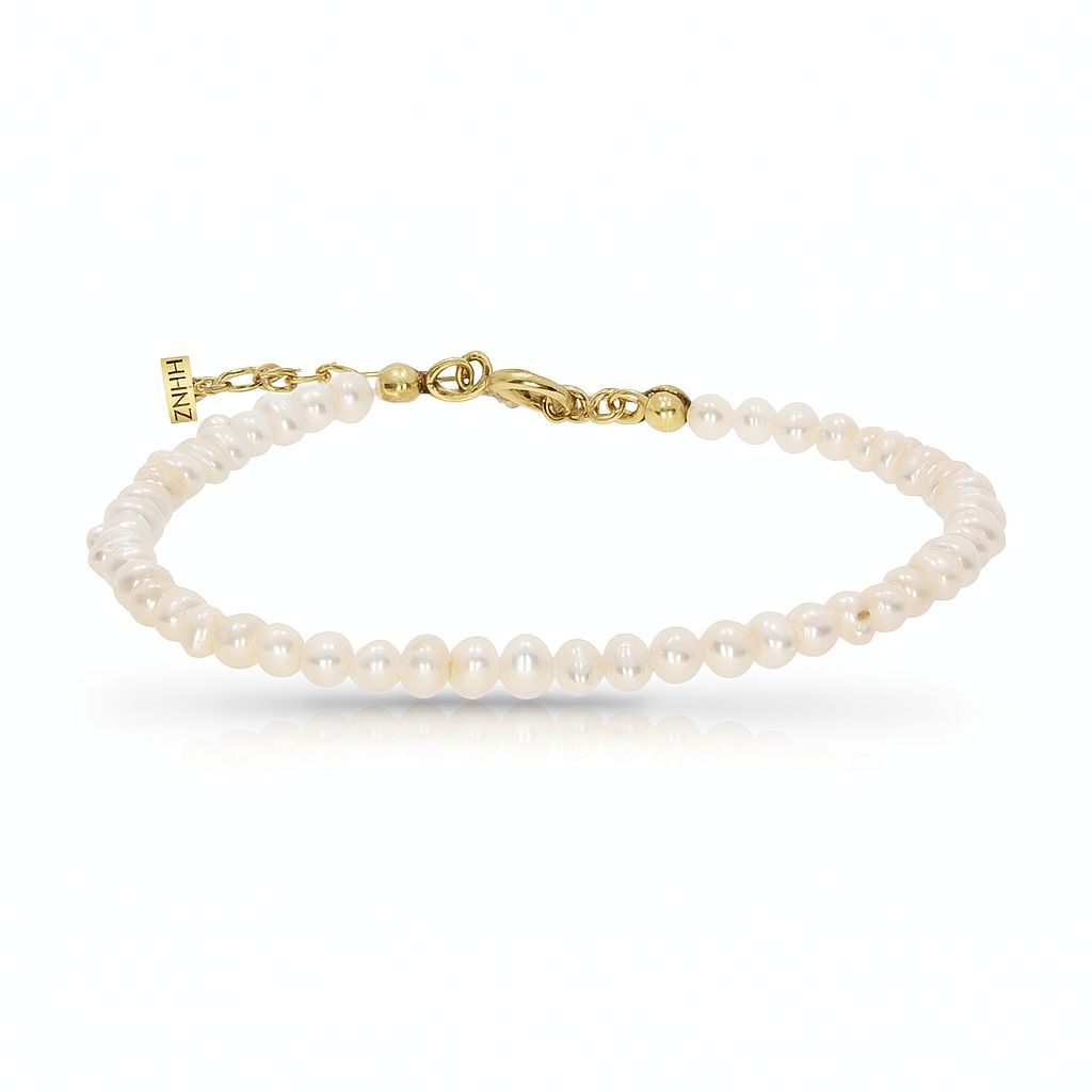 Eleganta fina si rafinament intr-o bratara atemporala cu perle de cultura. Realizata din argint 925 placat cu aur 24k si decorata cu perle de cultura de 3–4 mm, aceasta bratara aduce un plus de luminozitate si delicatete oricarei tinute. Perfecta pentru ocazii speciale sau purtare zilnica, este un accesoriu feminin, clasic si mereu in tendinte.