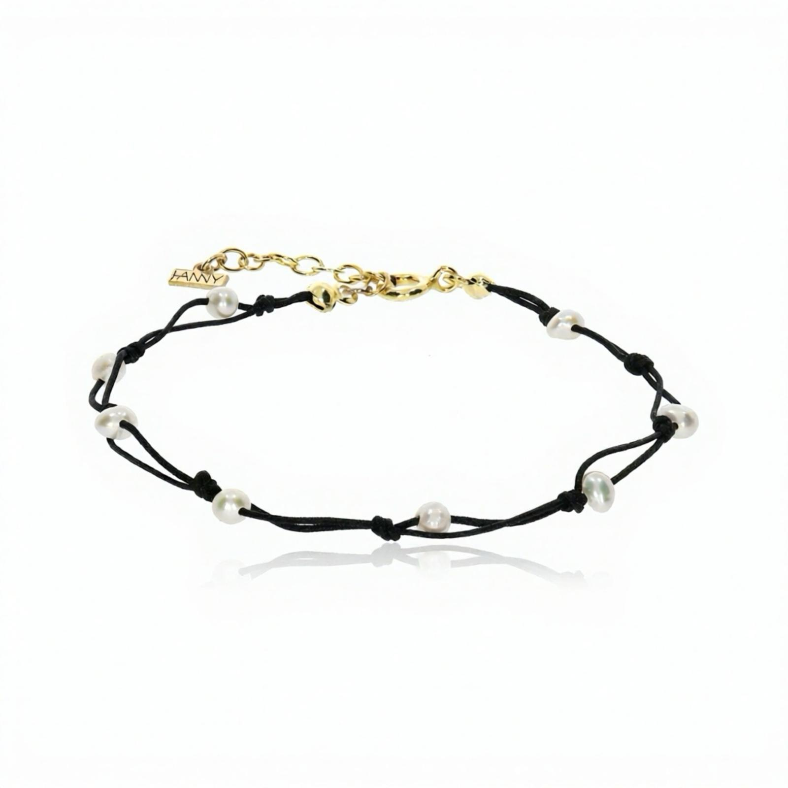 Bratara fina si moderna, realizata din snur negru rezistent, decorata cu perle de cultura dispuse la distante egale pentru un efect elegant si minimalist. Inchiderea din argint 925 placat cu aur 24k adauga o nota rafinata si ofera siguranta la purtare. Perfecta pentru a fi purtata individual sau in combinatie cu alte bratari.