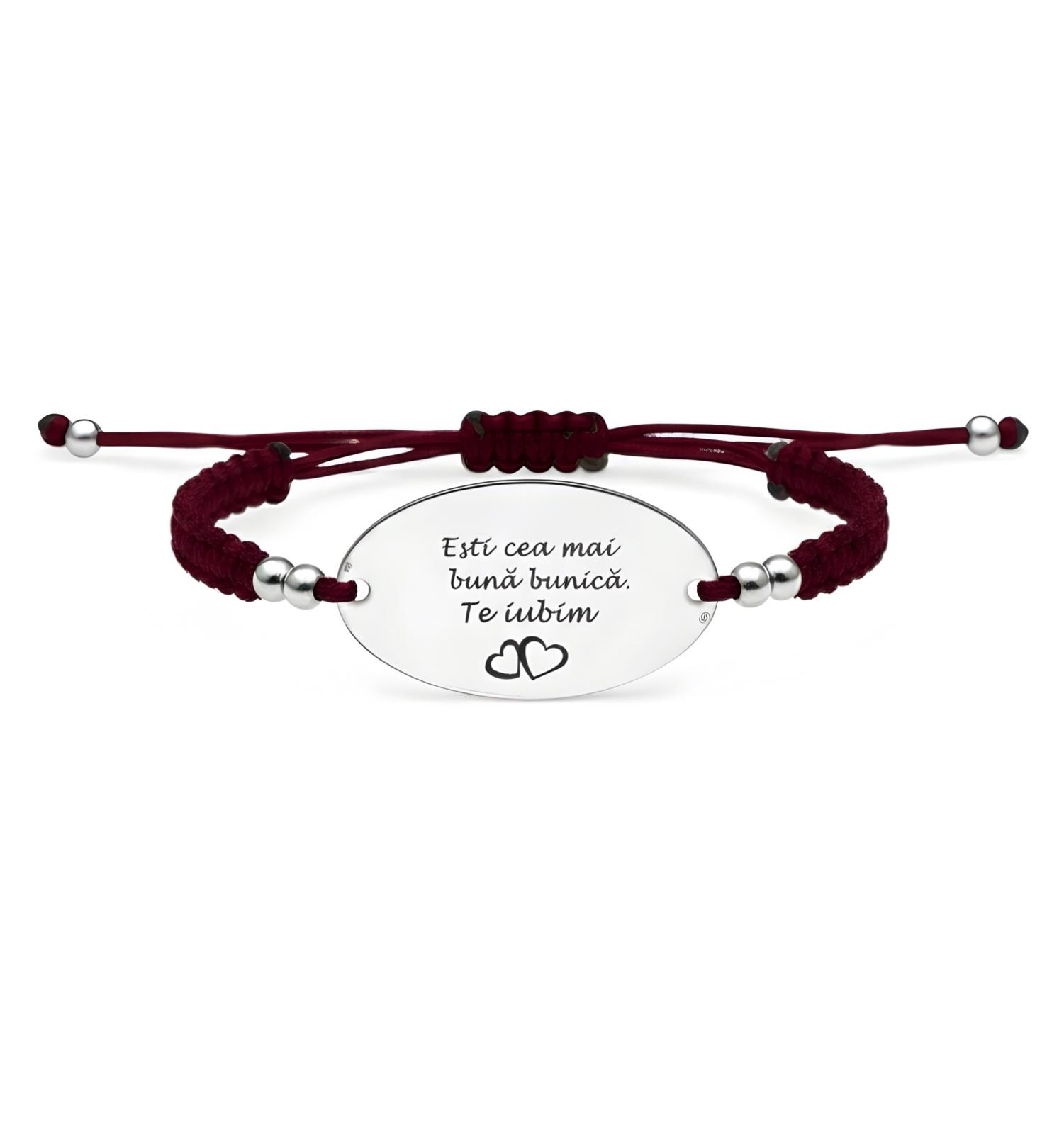 Bratara din argint 925 gravata cu mesajul „Esti cea mai buna bunica. Te iubim!” este un cadou plin de emotie, creat pentru a celebra dragostea neconditionata dintre nepoti si bunici. Designul elegant, completat de snurul impletit bordo si inimioarele gravate, transmite caldura si recunostinta intr-un mod rafinat.