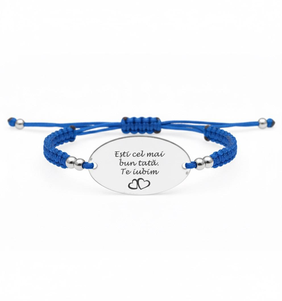 Bratara din argint 925 cu mesajul gravat „Esti cel mai bun tata. Te iubim!” este un cadou special, plin de emotie si recunostinta. Designul simplu si elegant, completat de snurul impletit albastru, simbolizeaza protectia, forta si legatura unica dintre tata si copii.