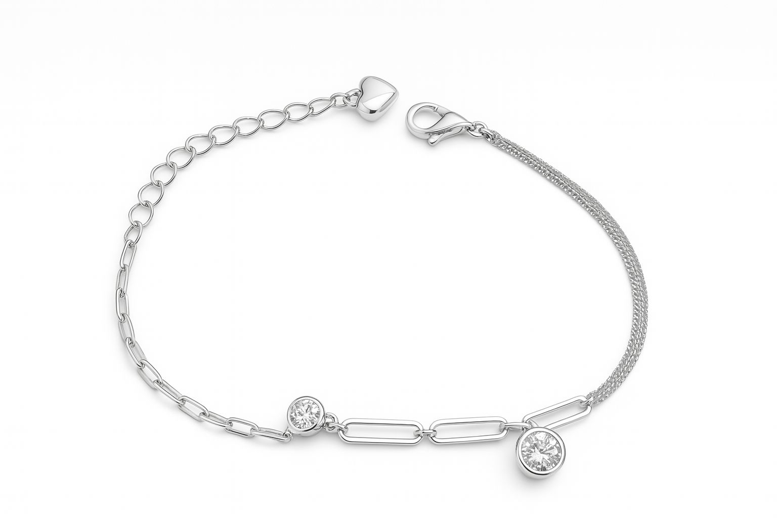 Aceasta bratara moderna imbina doua tipuri de lanturi pentru un efect vizual deosebit: un lant fin tip plasa si un lant cu zale ovale, ambele completate de doua pietre albe rotunde din zirconiu. Designul este minimalist dar elegant, potrivit atat pentru tinute de zi, cat si pentru ocazii speciale.