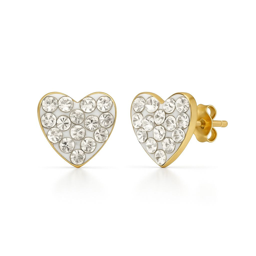 Cercei eleganti in forma de inima, decorati cu cristale albe, delicat stralucitoare, ce adauga un plus de feminitate si stil oricarei tinute. Realizati din materiale antialergice, fara nichel, sunt perfecti pentru persoanele cu pielea sensibila si pentru purtare zilnica confortabila.