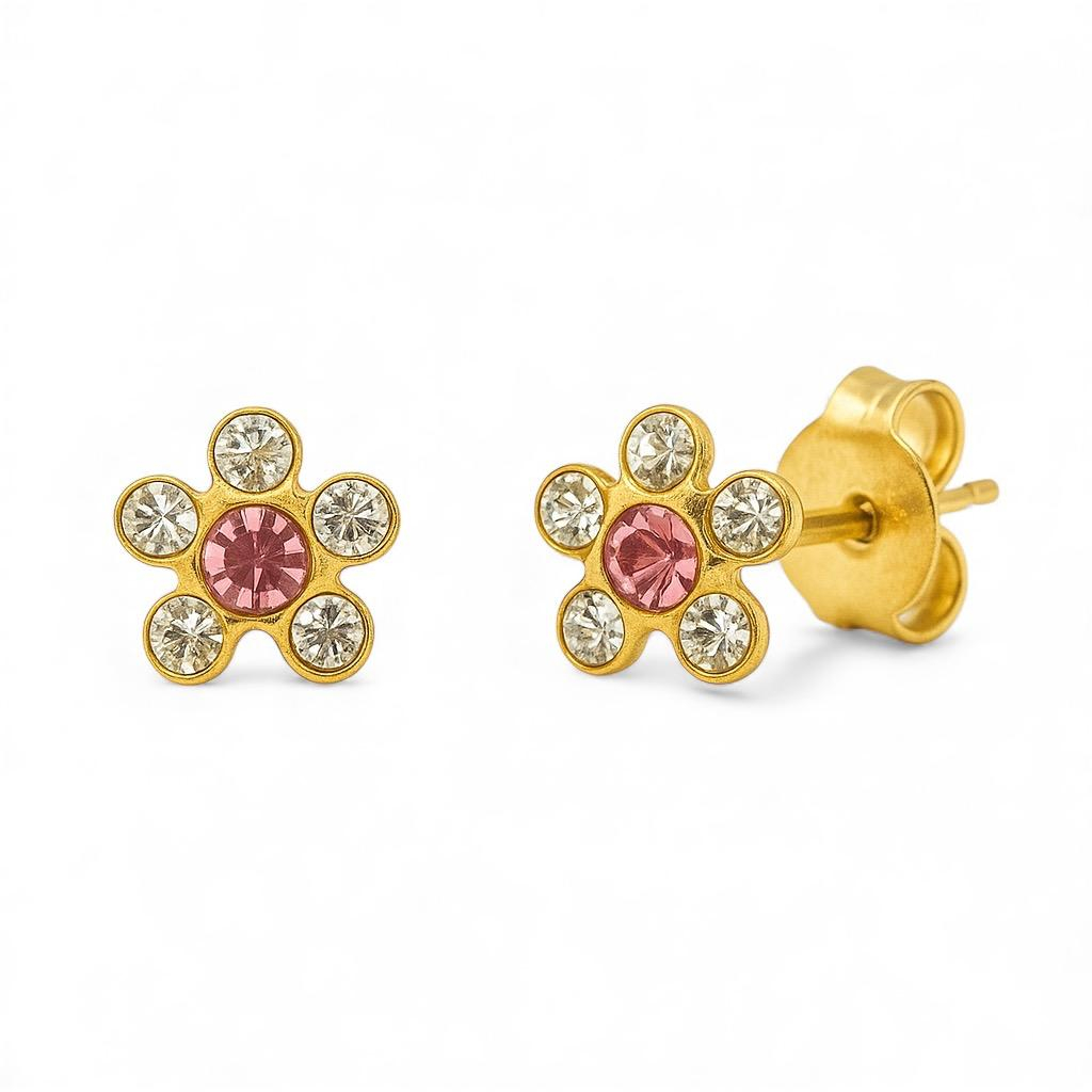 Cercei adorabili in forma de floricica, cu cristale albe, perfecti pentru un look vesel si plin de energie. Realizati din material hipoalergenic placat cu auriu, sunt potriviti pentru pielea sensibila si pot fi purtati zilnic, atat de copii, cat si de adulti.