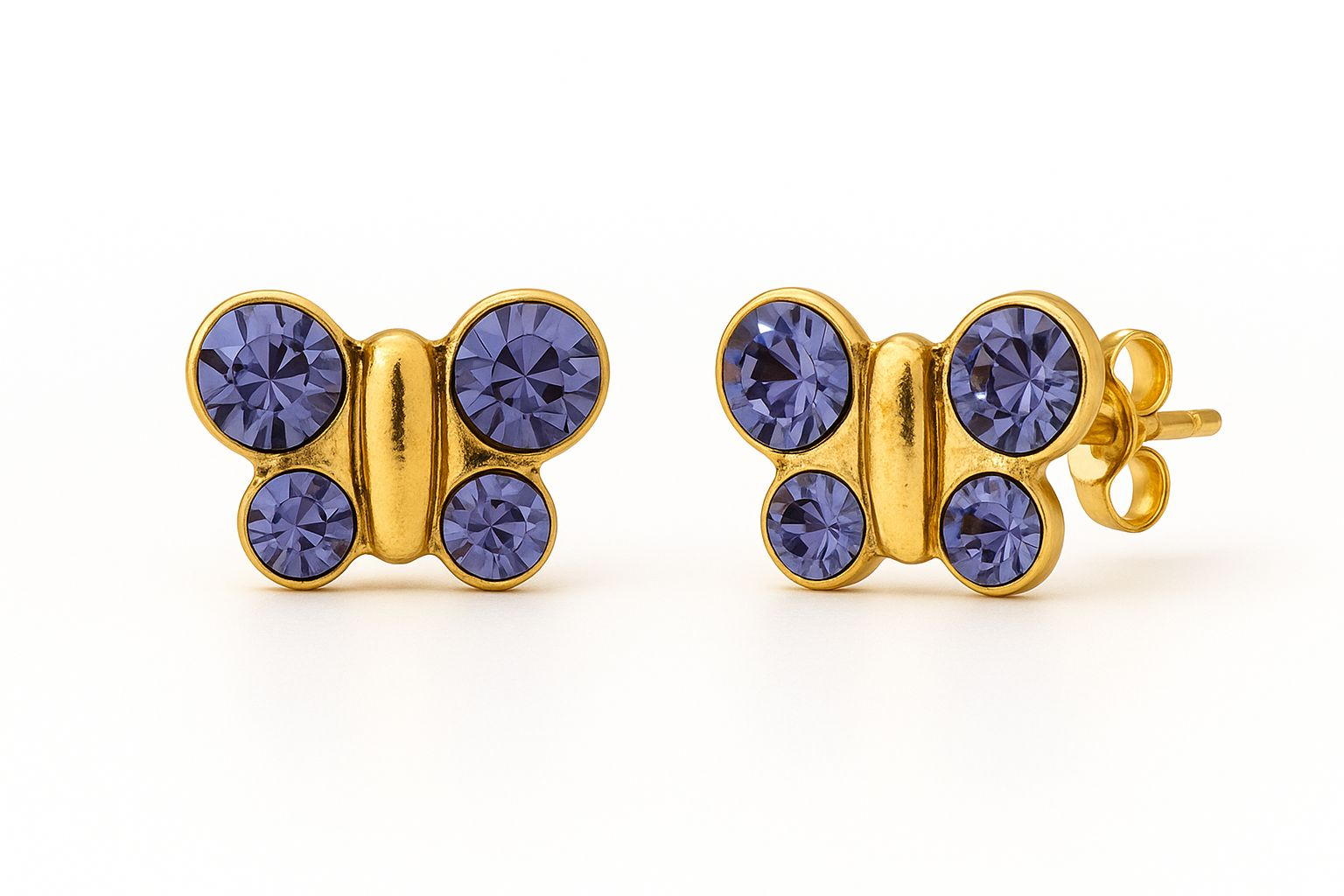 Cercei fluturas aurii cu cristale lila– hipoalergenici, fara nichel