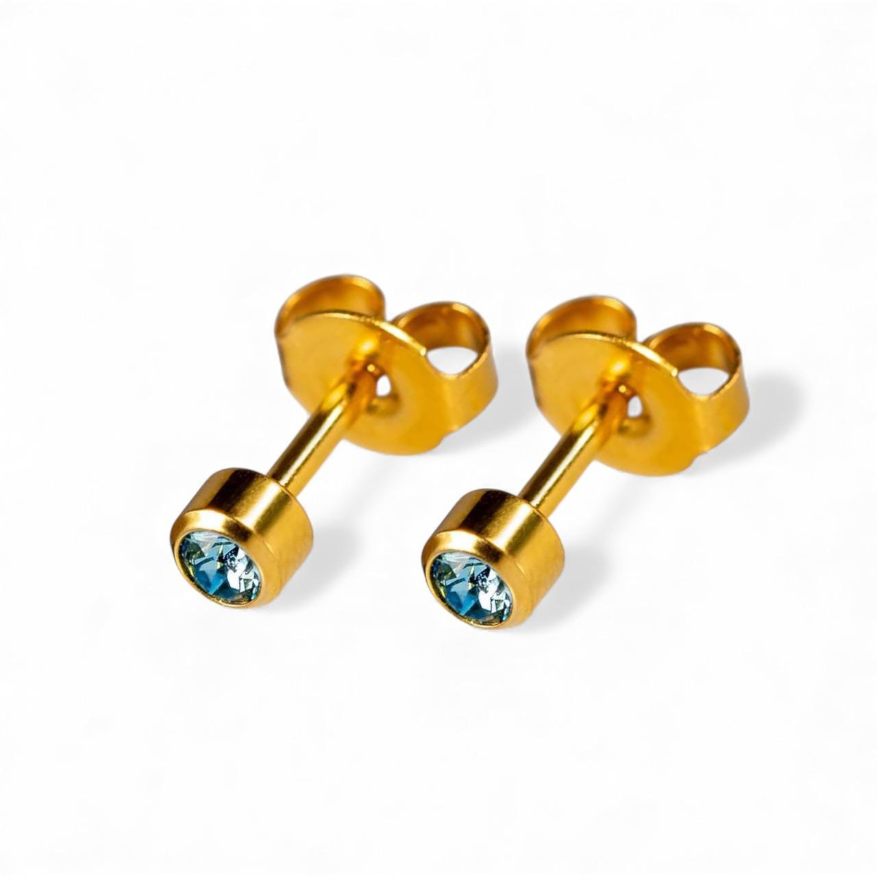 Realizati din otel inoxidabil acoperit cu strat galben si decorati cu piatra acvamarin, acesti cercei sunt hipoalergenici si nu contin nichel – ideali pentru persoanele cu piele sensibila sau alergii.