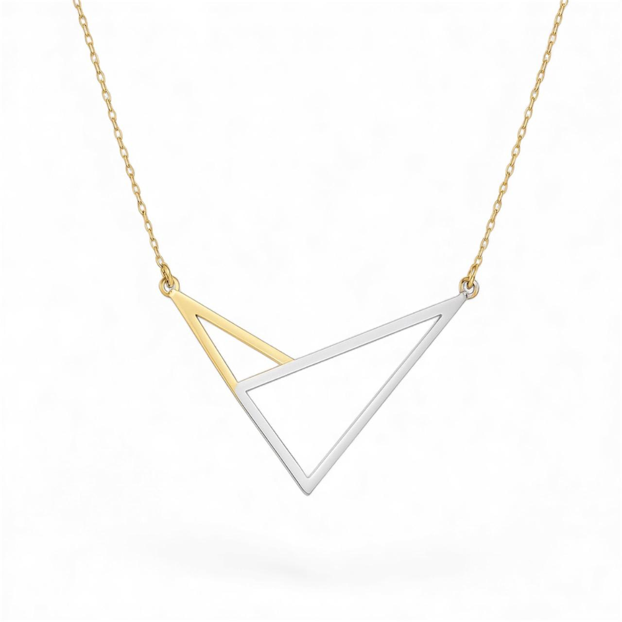 Lantisor modern realizat din Argint 925, cu pandantiv geometric in forma de triunghi, format din doua finisaje: jumatate argintiu si jumatate suflat cu aur. Designul minimal si echilibrat imbina armonios cele doua tonuri metalice, oferind un aspect elegant si contemporan.