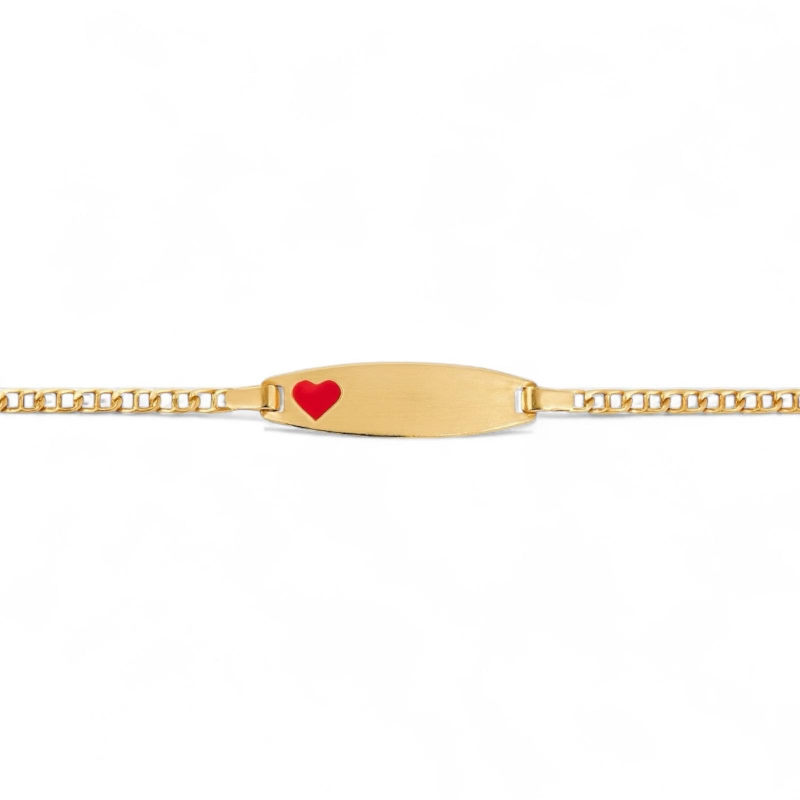 Aceasta bratara delicata din aur galben 14K este o declaratie de dragoste pura si simpla. Decorata cu o inimioara rosie emailata, aduce un plus de culoare si emotie unei bijuterii clasice. Placuta centrala, perfecta pentru gravura, ofera ocazia personalizarii cu un nume, data sau un mesaj cu semnificatie.