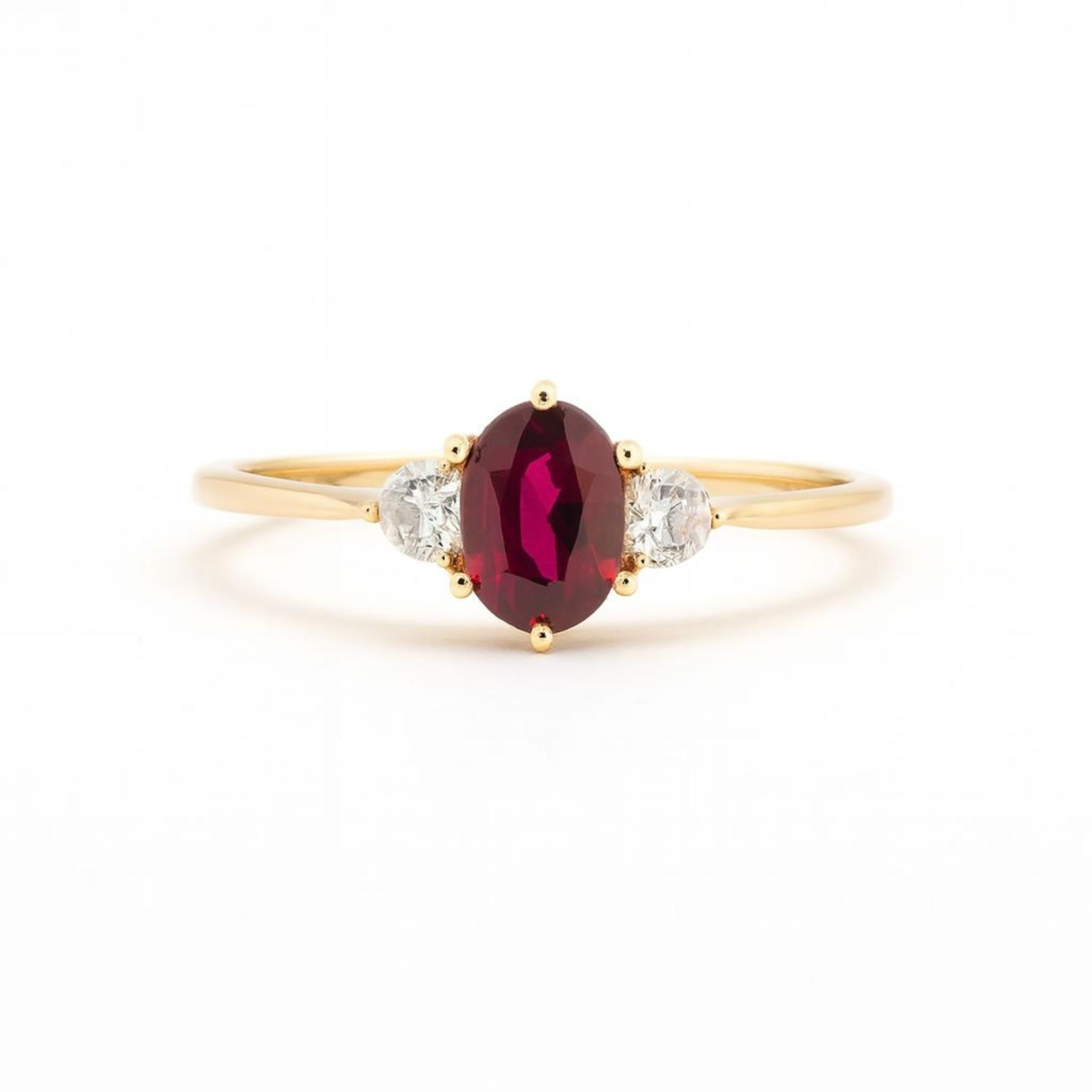 Inelul ''RUBY GLARE'' din aur galben 585 este o bijuterie clasica cu accente regale. Piatra centrala rosie, de tip rubin, este completata armonios de doua pietre laterale transparente, care adauga un plus de stralucire si rafinament. Designul este fin, feminin si ideal pentru momente speciale, dar si pentru un cadou deosebit.
