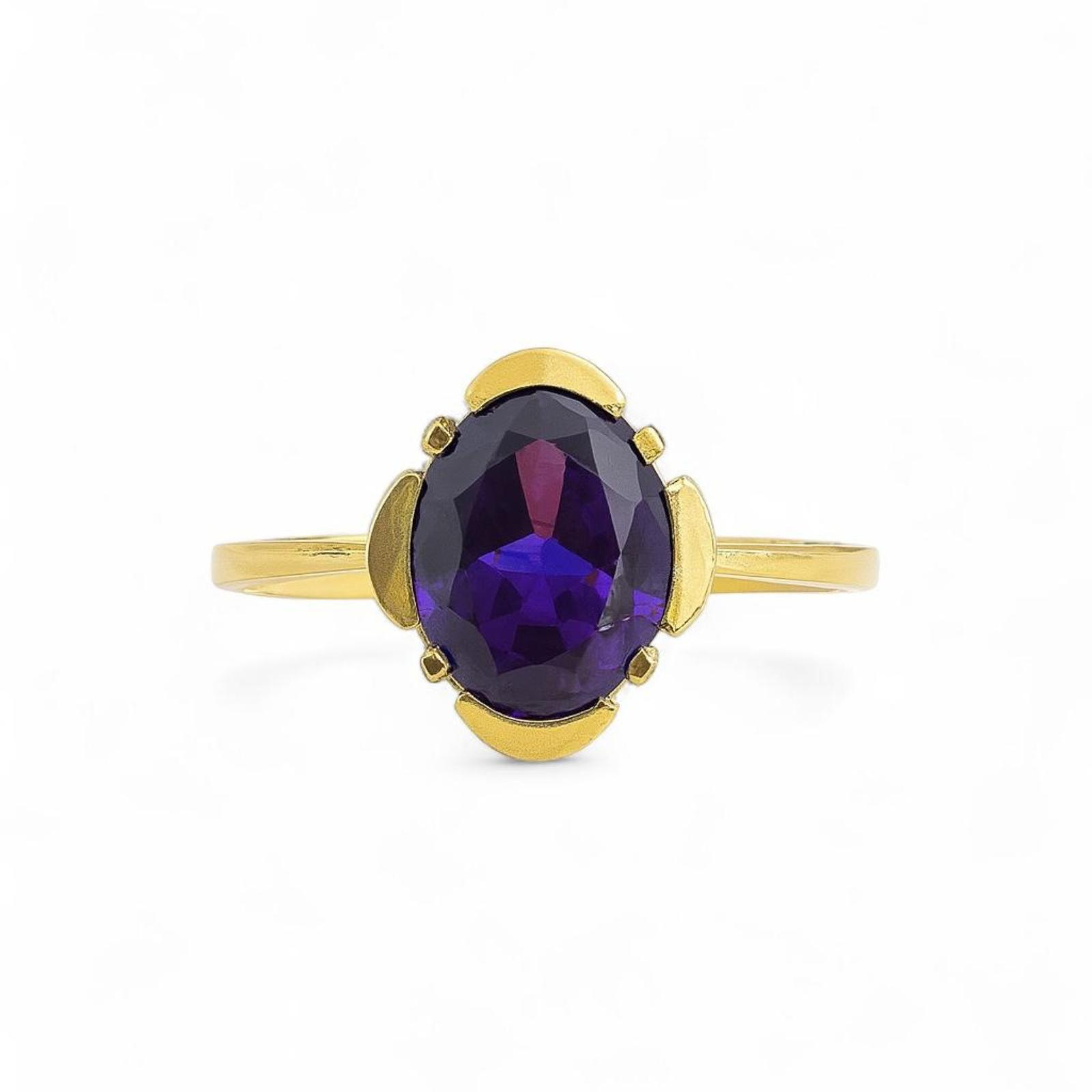 Un inel elegant, cu un design minimalist dar de efect, ce pune în valoare piatra centrală de un mov profund. Montura aurie subtilă încadrează perfect piatra ovală, oferind un aer rafinat și modern. Ideal pentru o apariție sofisticată.